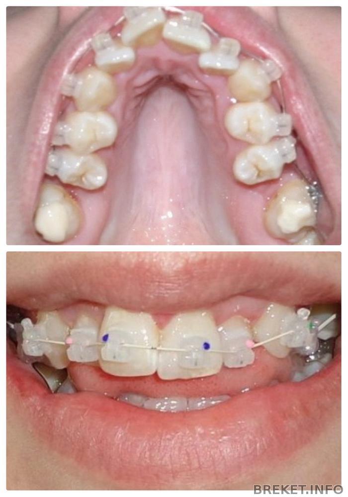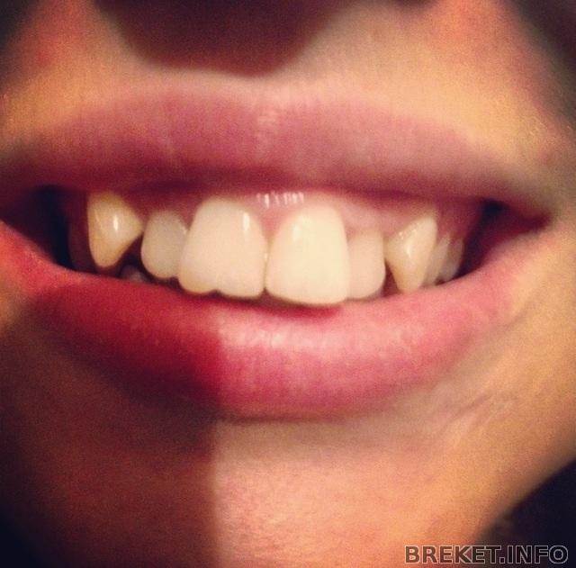у меня фоток нету, попробую словами: дистальный прикус, правый клык сверху из десны лез, передние зубы один на другом нахлестом лежал. не смертельно, ноя никогда не улыбаась открытым ртом.