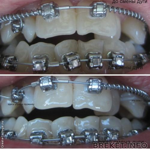 , я в ответ «Да мне не столько больно, сколько страшно». Вообщем работает она быстро, профессионально по окончании процедуры дала зеркало и показала что было сделано. Ура!!! Одну пружинку сняли, которая как раз натерала мне все до мозоли, пружинка сделала свое дело и больше не нужна, а также какой-то белой эластичной цепочкой зацепила верхнюю двойку и зацепила её за соседние брекеты чтобы помочь выдвинуть его вперед.. Как только вышла из кабинета начала по нарастающей болеть эта двойка. А потом и все зубы подряд, как же больно, все- коренные и передние, болят как сговорились весь вечер, на ночь выпила анальгин, утром проснулась и они опять заболели,до сих пор не прикасаюсь к ним даже зубной щеткой, больно!!! Неужели так будет всякий раз как будут менять дугу??? ![]()
