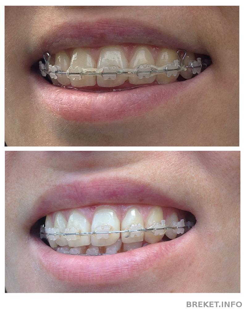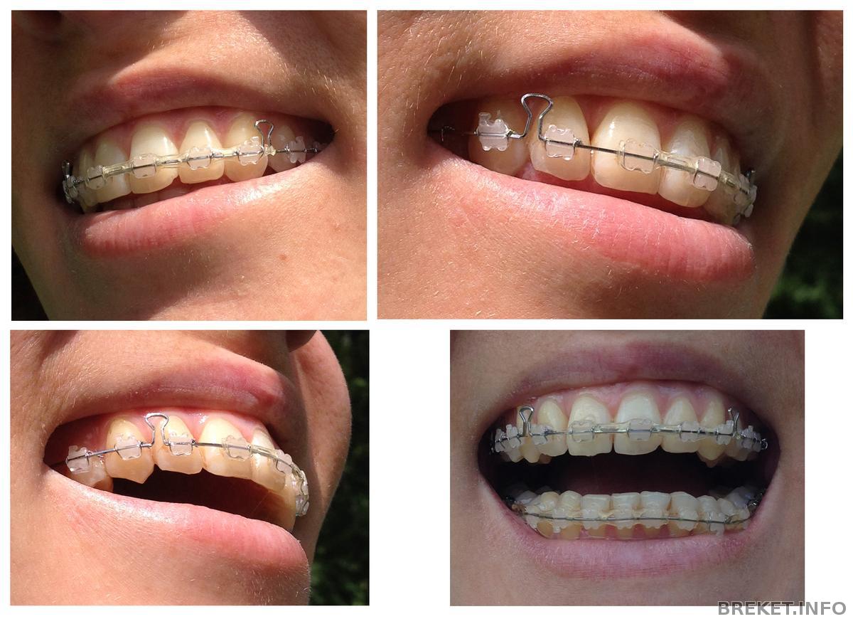 И о некоторых нюансах сапфировых брекетов. Я их выбрала, т.к. посчитала менее бросающимися в глаза. Но они были таковыми только в первый день каждого посещения ортодонта, т.к. каждый раз одевались новые прозрачные лигатуры, и брекеты действительно были менее заметны. Но уже через день лигатуры становились все темней и темней, и перед следующим посещением были уже грязно-желтого неприятного цвета.