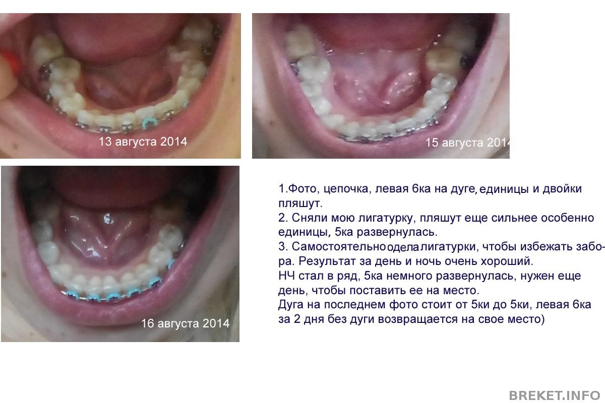 Второе это уже 2й месяц мне одевают эластичную цепочку на НЧ, без лигатур и что ты думаешь, зубы едут в разные стороны буквально за пару часов, а на место чтоб их поставить я лично одеваю лигаруты и за день другой они становятся в ряд) Врач не может наблюдать тебя круглые сутки, поэтому не может быть полностью прав в лечении.
