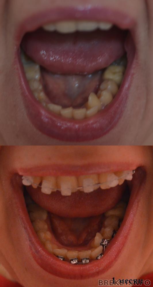 Была установка пластиковой коронки и БС на обе челюсти на протяжении 5 часов. Был дискомфорт при чистке зубов пару дней. Был отколот брекет во время поедания шоколадной конфетки. Научилась есть не жуя. Стала чаще улыбаться.