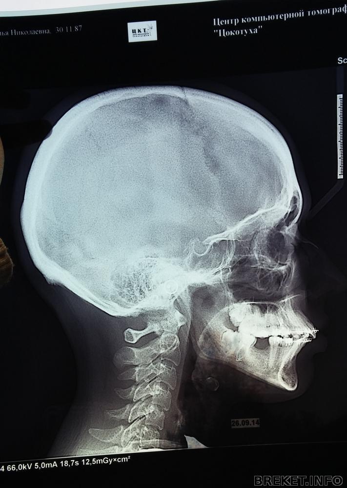 Срок брекетоношения близится к отметке "год". Но новости безрадостные, чувствую не скоро это закончится. Побывала ещё у одного ортодонта. На этот раз это был проверенный профессионал своего дела. Ну естественно мне сказали об удалении 4ок, в последствии и 8ок(чтоб не было рецидива после лечения). Подтвердили о том, что на единице брекет наклеен не правильно, от того и криво стоит зуб. Я всё это знала и сама..нужно было профессиональное подтверждение, почти за 3000т.р (снимки+консультация) я это подтверждение получила. Надо заметить, после снимка в профиль я была в шоке. Дистальный прикус ужасен. И мой нынешний ортодонт через месяц собирается снимать брекеты. Считает, что всё отлично. Фото прилагаю:
