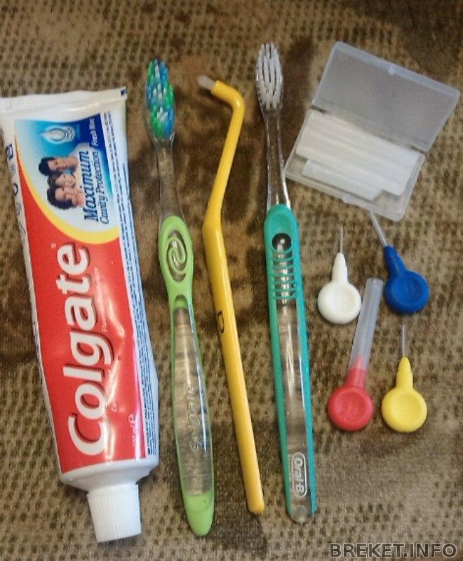Еще хотелось бы сказать про уход за брекетами и за зубами в них. Чувствую себя помешанной на чистке зубов:D И я ничего из этого сама не покупала, все выдала ортофея (кроме зубной пасты и зеленой щетки правее). + к фотографии еще 2 ополаскивателя: для дома большой и с собой, поменьше