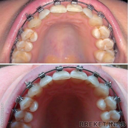 Дуга самая тонкая из прямоугольных. Я думала, что широкий край будет вперед смотреть, оказалось вверх. Когда прямо смотришь, не сильно заметно, что дуга потолще. Как я и предполагала, зубки повернулись по оси. Уже почти с двух месяцев вид ВЧ снизу не менялся, а тут за месяц такой прогресс! Ясно, не идеал, так и время еще есть. Я уже настроилась на 2 года, даже обратный отсчет поставила в профиле, хотя срок снятия не оговаривали с