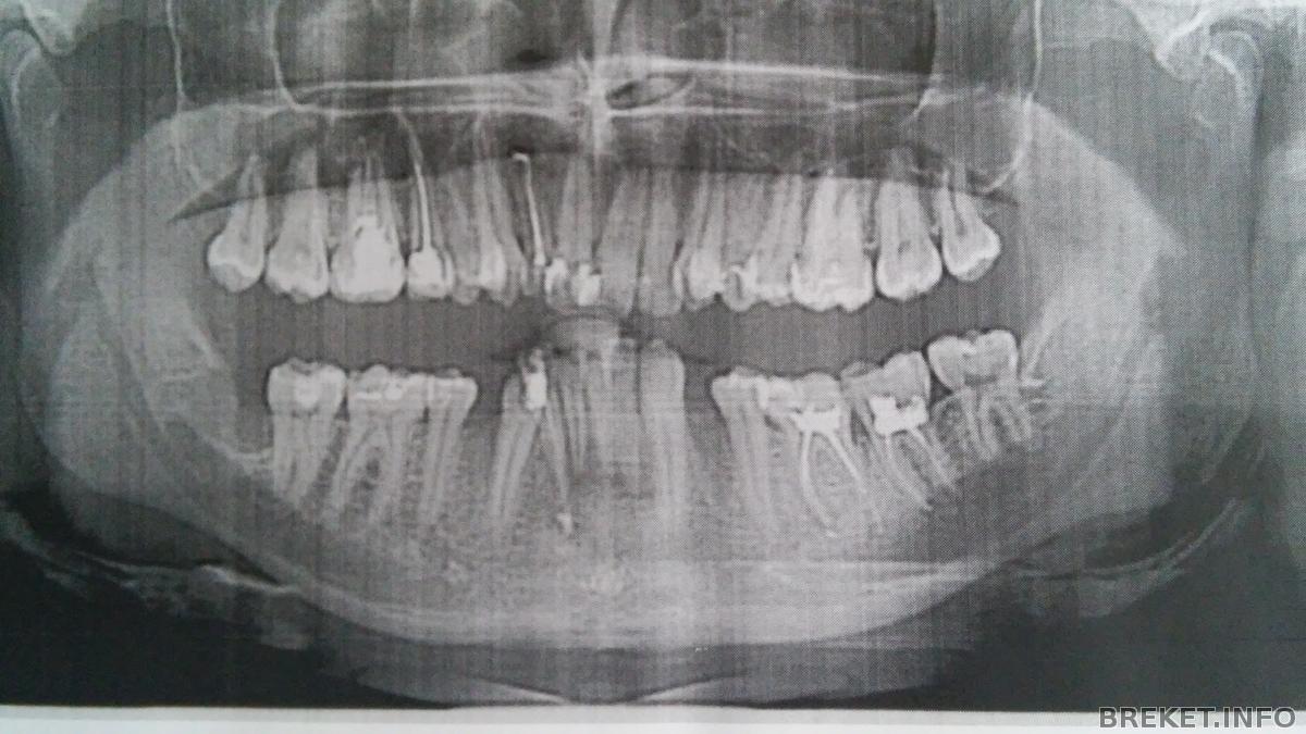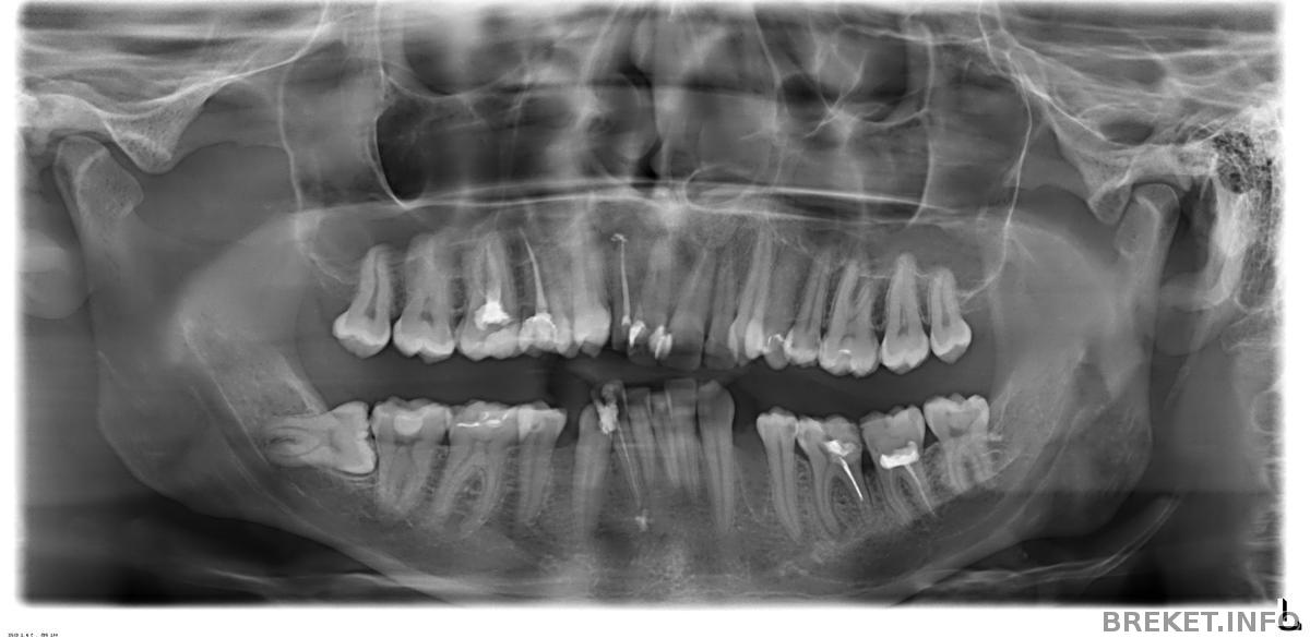 Панорама после удаления 8-ки и перелечивания каналов депульпированных зубов: