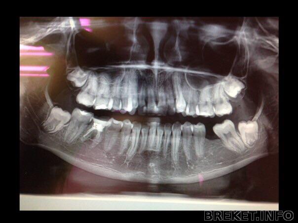 А насчет зубов мудрости, вам перед установкой брекетов должны были сделать панорамный снимок, как на фото (прилагаю). И по слепкам ортодонт должен был рассчитать: надо ли их удалять, или места хватает и они будут расти.