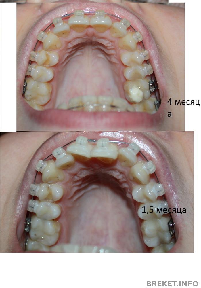 До установки БС на НЧ зубы от правой 4-ки (удалена) до левого клыка были очень ровные и на одной высоте. А вот дальше зубы резко уходили вниз. После месяца брекетов они пошли вот такой вот волной, т.к. пятерки потянули вниз клыки, а клыка двойки.