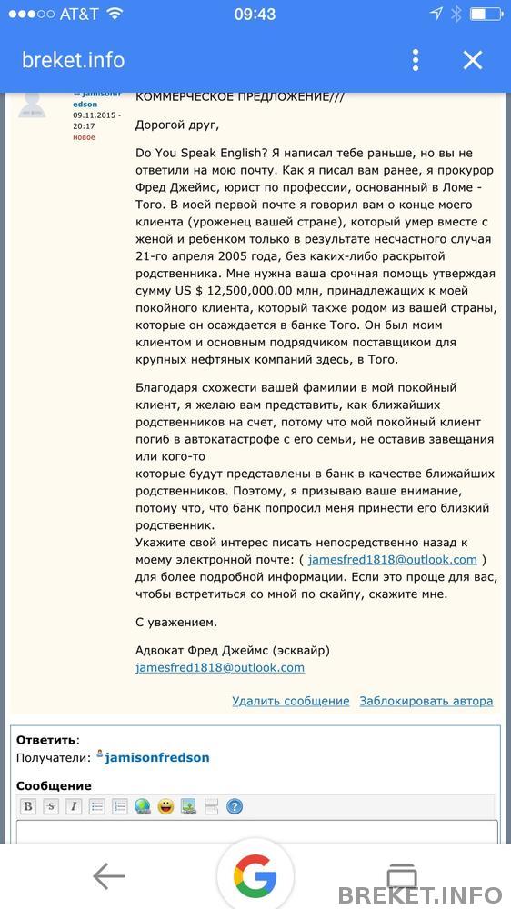 Они добрались и сюда! На этом сайте в личку мне прислали нигерийское письмо. Кто не знает, это якобы умер богатый дядюшка без родственников, а моя фамилия похожа. Адвокат дядюшки хочет все деньги отдать мне! Аккуратнее