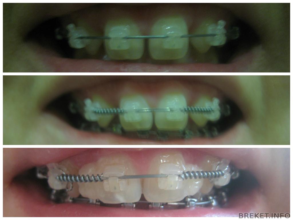 Прошло 4 с небольшим месяца, как я живу с брекетами. Особенных трудностей за это время не испытала: дикой боли не было, брекеты пока не отпадали, ем осторожно почти все подряд, никаких натираний, воск ни разу не применялся. Диастема затянулась, клычки послушно двигаются назад. "Нарастили" временные "двоечки", жду имплантации постоянных. Прилагаю фото: верхнее - декабрь, в середине - январь, внизу - февраль.