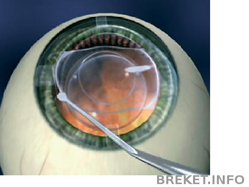 Введенная в глаз внутриглазная контактная линза расправляется и занимает положение в жидкости глаза между естественным хрусталиком и радужкой.