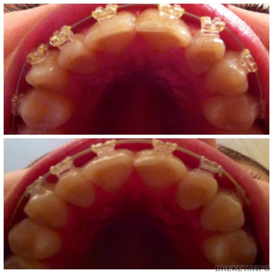 Еще очень не нравится пломба на переднем зубе, зуб выровнялся и она ушла, как бы назад, на фото видно, очень хочу ее заменить, чтобы зубик стал ровным, но это только в конце лечения. И, кажется, зубы пожелтели, в районе замочков, наверное потому что не так активно чищу (очень уж лень последнее время), тешу себя надеждой, что когда сниму и чистить станет легче, то они вернут себе естественный цвет.