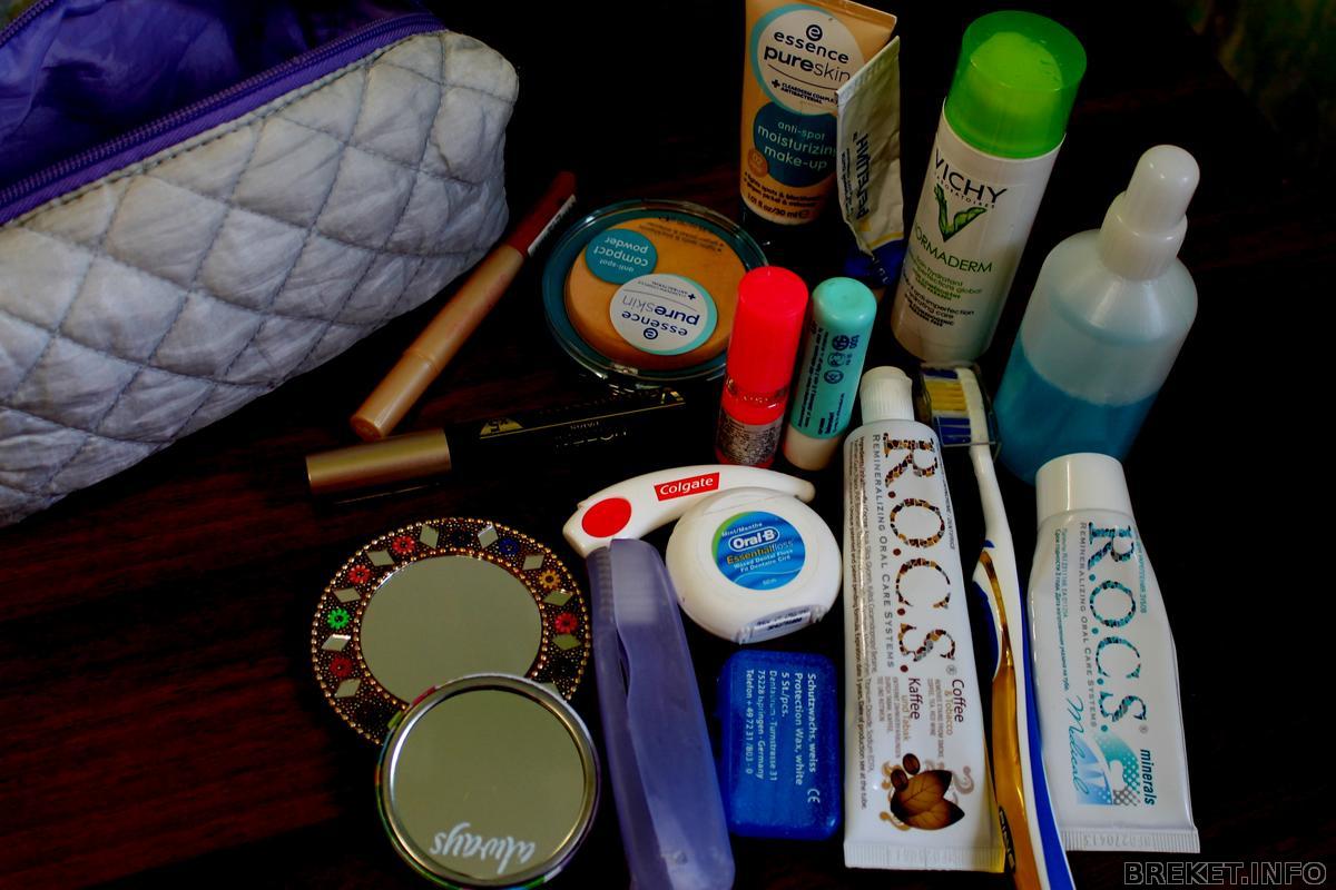 2 зеркала, зубная дорожная щетка splat, ерщик colgate, floss oral-B, воск выданный ортодонтом, паста rocs "кофе и табак" она не гелевая, без антисептиков, вкус приятный. Щетка с V-вырезом, щетка конечно не очень, но защитный колпачке на щетине увеличивает её положительные качества, гель Rocs minerals, для укрепления зубов, использовала его до установки БС, сейчас наношу после обеда на по чищеные зубы, не знаю помогает или нет. В бутылочке из под Хлоргекседина я ношу ополаскиватель, очень удобно. Еще есть вещи к брекетам не относящиеся, крем viсhy ,гель регецин, пудра и тональная основа essence для проблемной кожи, тушь loreal, гигейническая помада nivea и полупрозрачная помада essense. Вроде все. Все это я ношу с собой каждый день без исключения на протяжении недели, всем пользуюсь ну кроме воска, он лежит на всякий пожарный.