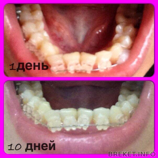 Вроде уже заметны изменения, вчера вечером жутко разболелись нижние однерки и двойки, десны были красными, а сегодня утром уже правая (по фото) однерка повернулась вглубь рта, на нее не надели лигатуру (зубы сильно скучены были и не зацепить было брекет резиночкой) вот и закрутило ее