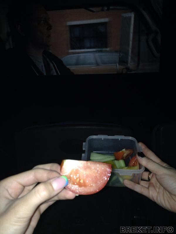 У меня подруги в кино гречку кушали, взяли с собой на работе не успели съесть, сели кино смотреть, одна другую в бок толкает "ну что сидишь вилки доставай!"
