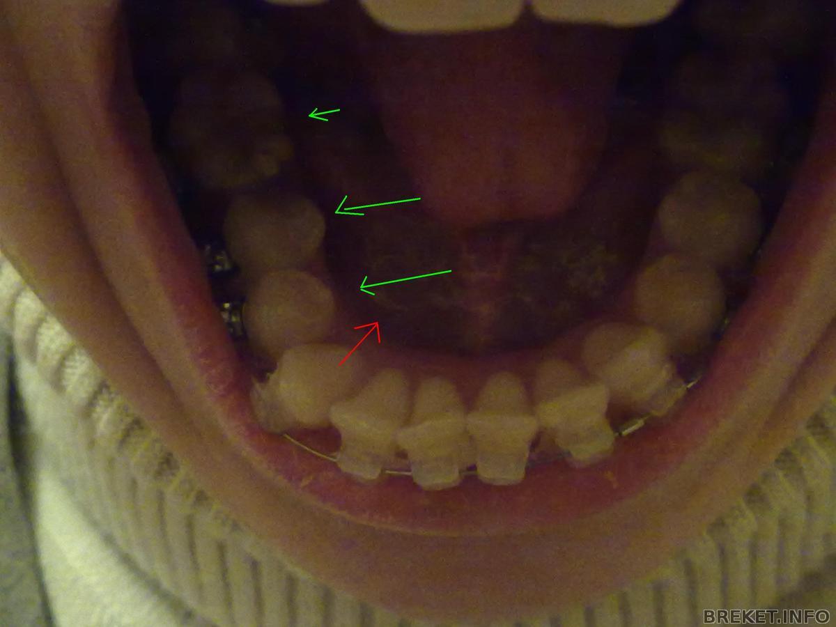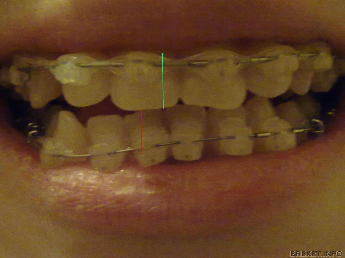 зеленым отмечено где примерно будет центр ВЧ, когда закроется щель. Т.е. он совпадет с центром НЧ и центром лица. А красным мать его - где, судя по всему, окажется центр НЧ после окончания лечения если удалить эту четверку...