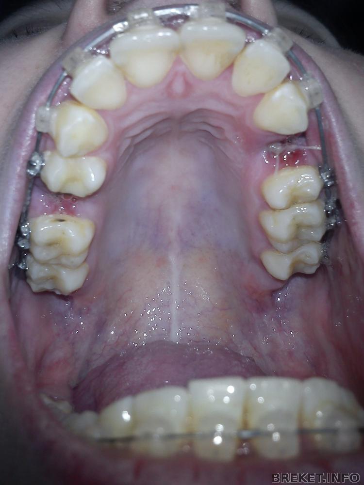 Значит после эластичных цепочек (кстати, тянут зуб они только неделю, потом только держат) в январе мне поставили железные пружины и проволоку которую закручивают для регулировки давления и за 2 месяца клык с одной стороны сдвинулся на пару миллиметров и с другой стороны четвёрка пол пути прошла, закрывая щель. Сегодня на приёме, мне поменяли дугу на нижней челюсти и на верхней затянули сильней крепление, чтобы клык встал на место, а с четверки всё сняли, так как её развернуло и нам нужно, чтобы она вернулась на место.
