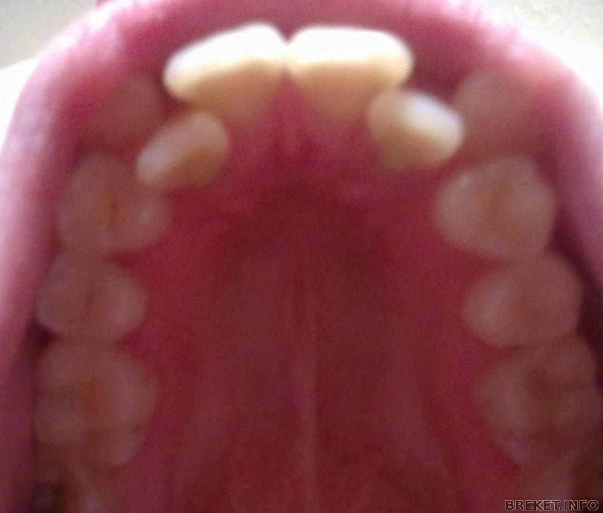 у меня фоток нету, попробую словами: дистальный прикус, правый клык сверху из десны лез, передние зубы один на другом нахлестом лежал. не смертельно, ноя никогда не улыбаась открытым ртом.