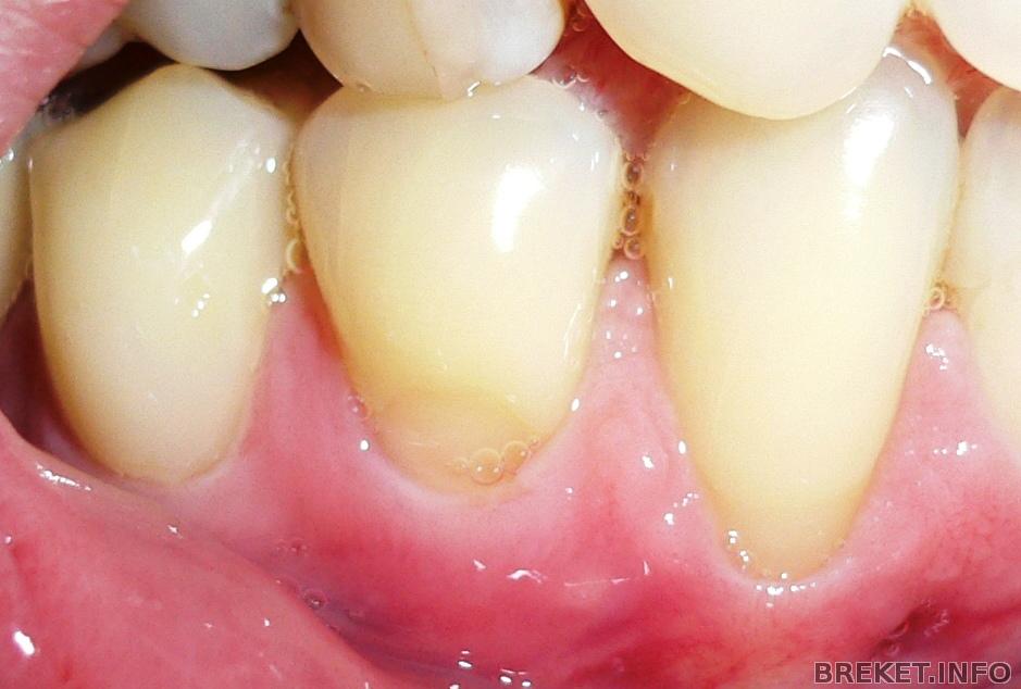 При рецессии зуб не травмирован, он здоров, но есть убыль десны около его шейки. Это не лечится, можно разве что эстетику восстановить, если это видно (пересаживание нового лоскута с неба). Но очень часто рецессия возникает из-за сильной нагрузки на костную ткань и десну и вот эту нагрузку нужно исключить. Делается это операбельным путем. Рецессия не закроется, но прогрессировать не будет. У меня как раз эта операция была, но у меня рецессия закрываться будет со временем, потому что мне еще пришивали лоскут искусственной матрицы.