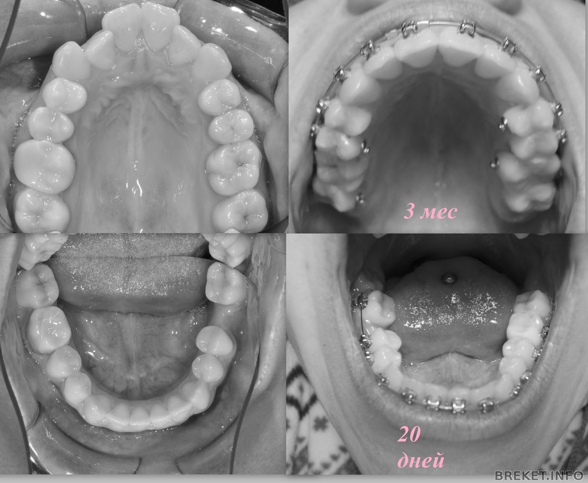 сегодня ровно два месяца после установки ВЧ) 19.04.2013 была на приеме у орта, поменяли дугу на ВЧ... зубки побаливают... когда сняли первую дугу, я почистила зубки и после этого мне одели уже более толстую дугу, было больновато конечно... еще переклеили брекет на НЧ (на единичке), но на НЧ пока без особых изменений... ВЧ уже получше... будем ждать супер результатов...)