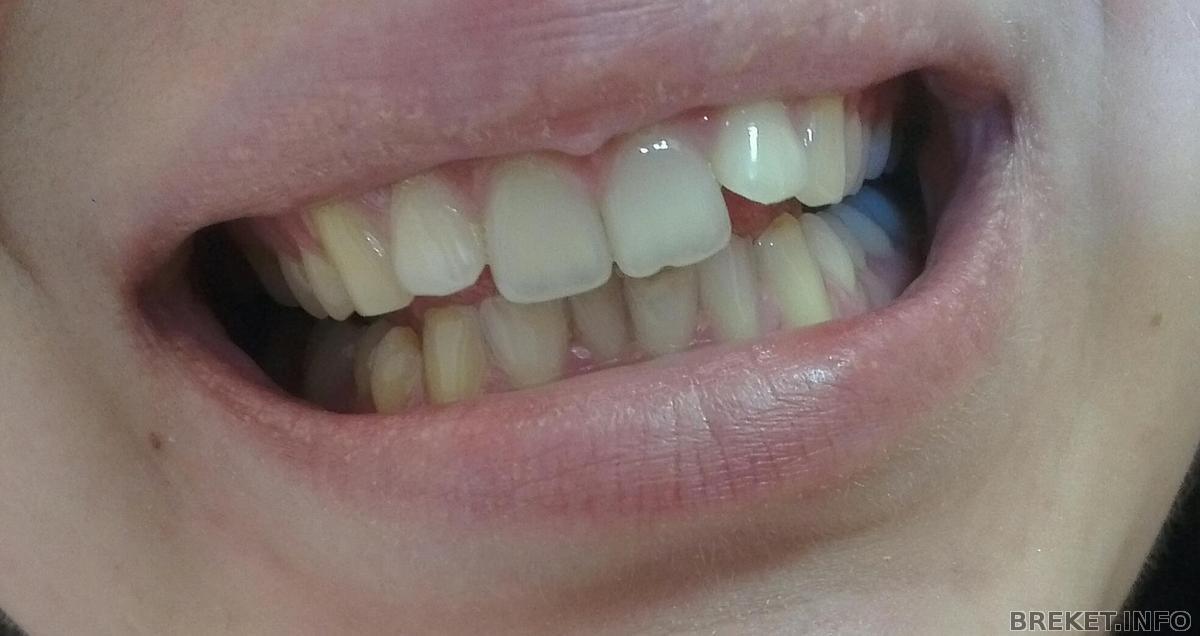 И теперь, когда левая сторона хорошо встала и по высоте, и в ряд... то правая единичка (была сзади), поднимаясь, оказалась как-то меньше левой... то есть стоит выше, в глаза при сомкнутых челюстях не бросается, а вот когда открываю рот, при разговоре и смехе... мда, видно...