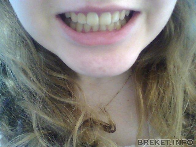 вот мои зубки на 2 день!! ничего не поехало ТЬФУТЬФУТЬФУ думаю еще попросить через 2 недельки мне единичку подпилить,как думаете?)) когда в зеркало смотрю очень довольна!!дефекты конечно есть,но думаю обычным людям(небрекетоносцам) они незаметны ))